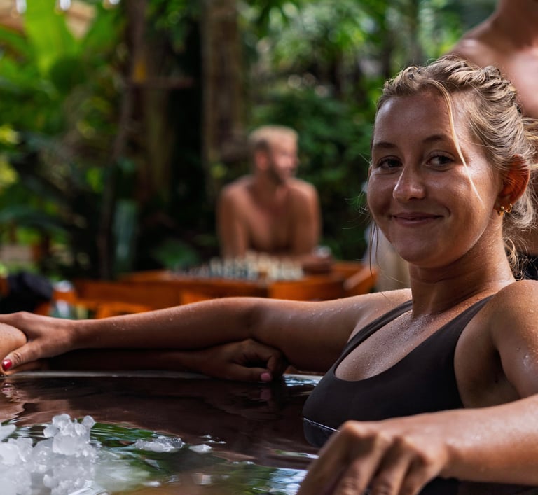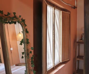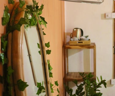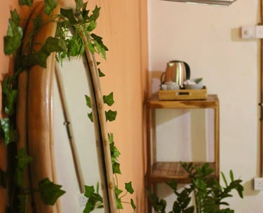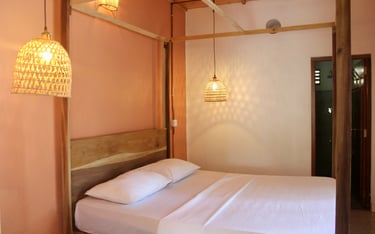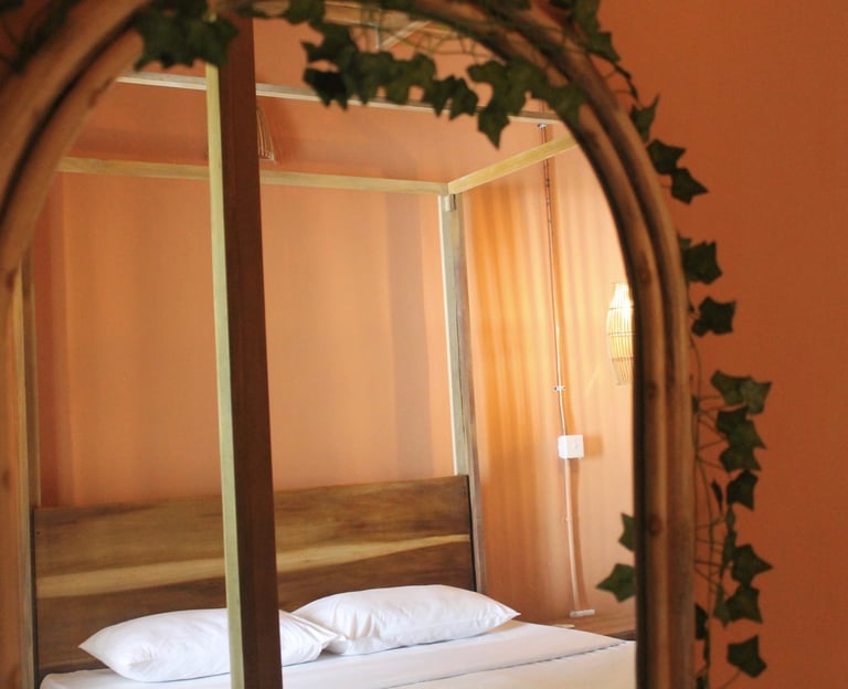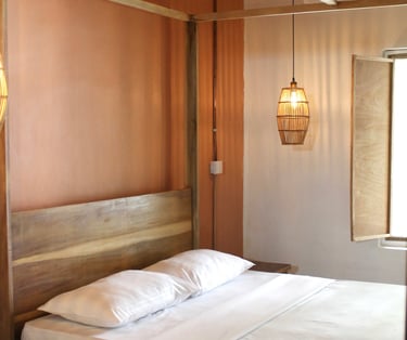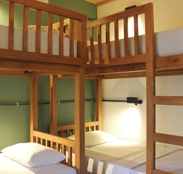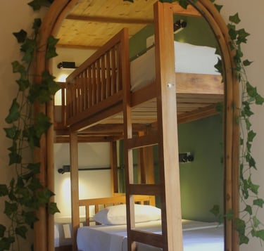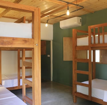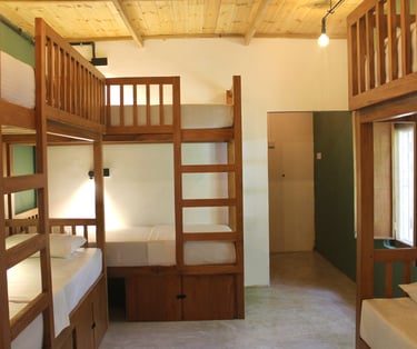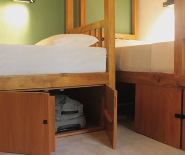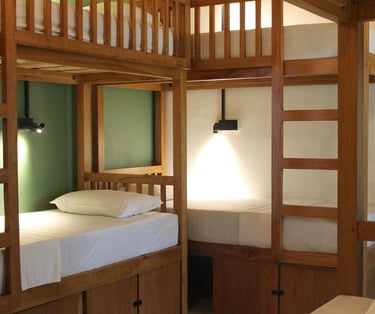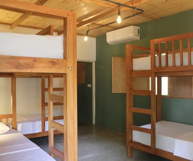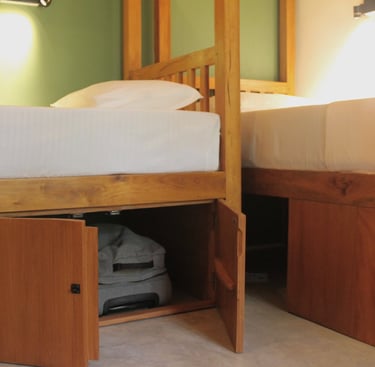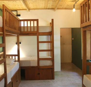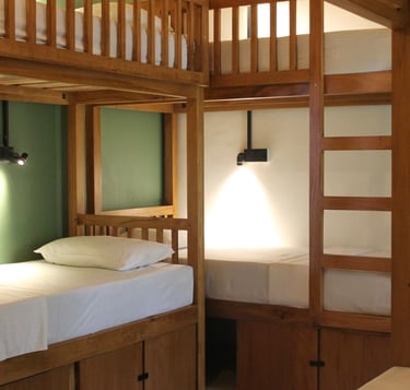 We have two 6-bed rooms, “Coconut Cave” & “Uma Ruma”, both beautifully designed for your comfort, with sturdy bunk beds and 8-inch thick comfy mattresses. These dorms have their own bathrooms, & each bed is equipped with an electric outlet, a lamp, a shelf and cabinet to keep your backpack safe and cozy.